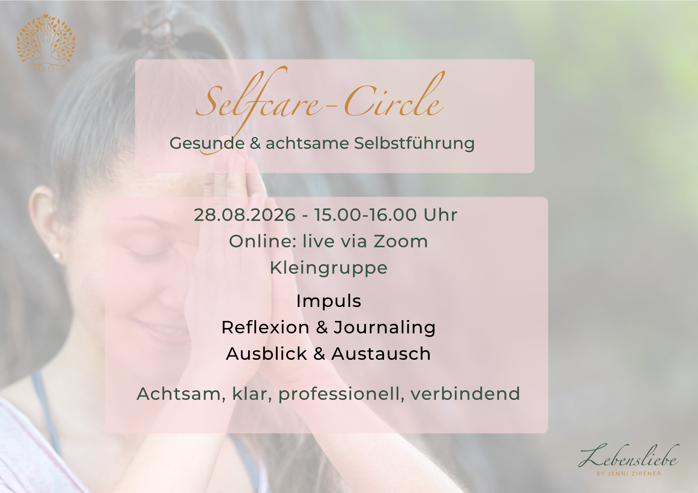 Der Self Care Circle ist ein regelmäßiger Online-Raum für Menschen, die bewusst innehalten, ihre Bedürfnisse wahrnehmen und neue Impulse für ein gesundes und erfülltes Leben entwickeln möchten.
