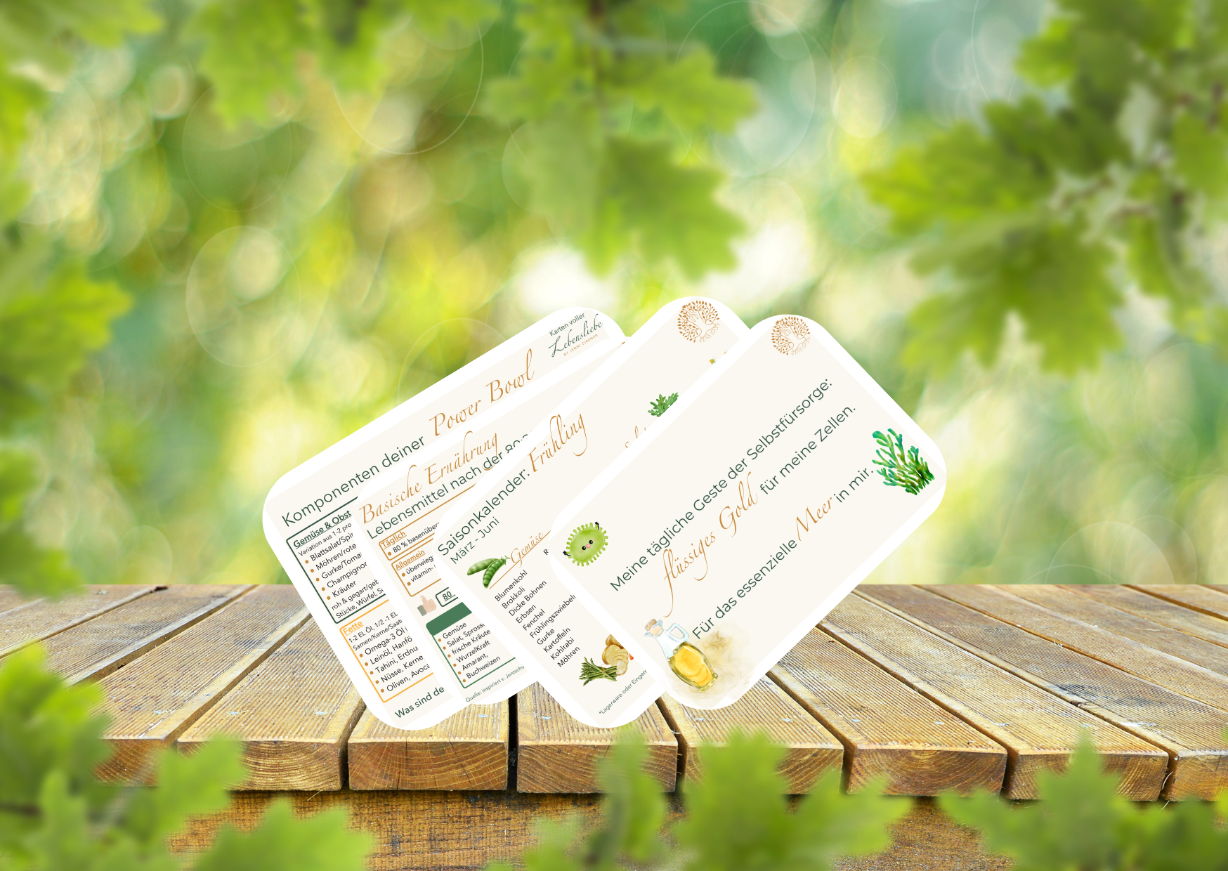 Die Lebensliebe Ernährungskarten verbinden verständliche Ernährungsinformationen mit inspirierenden Zitaten und klar gestalteten Grafiken.